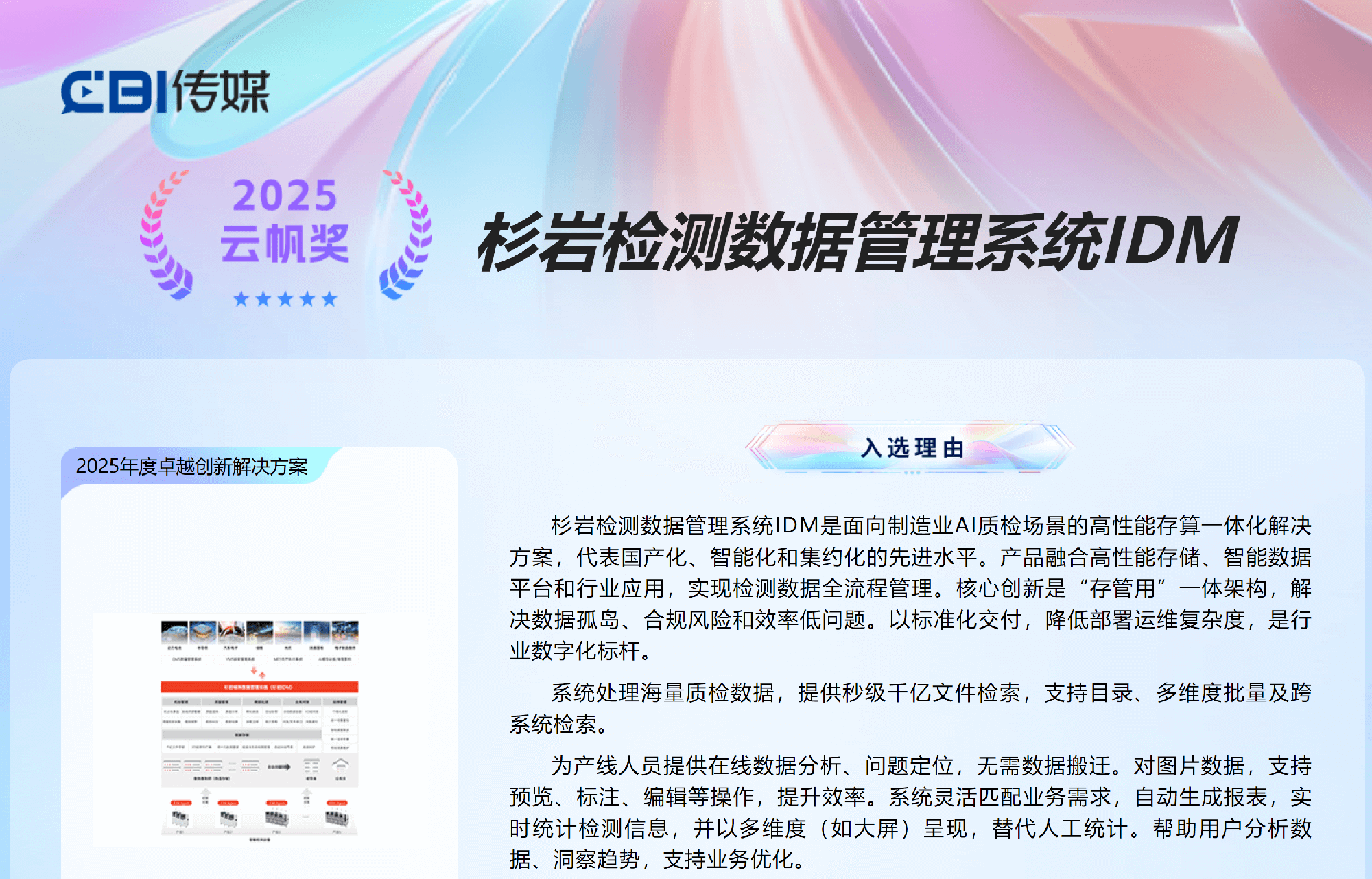 近日,由CBI传媒旗下专业研究机构——CBI数智研究院主办的2025年度“云帆奖”评选结果正式公布。杉岩检测数据管理系统IDM凭借其在制造行业卓越的方案创新性、前瞻性的技术架构与显著的实践价值,在众多优秀参评方案中脱颖而出,荣获“2025年度卓越创新解决方案”奖。该奖项的获得,彰显了杉岩数据以坚实数据基础设施底座赋能产业数字化转型的领先实力。