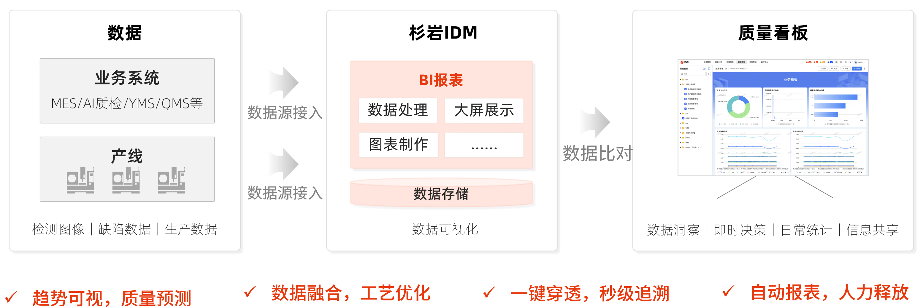 针对面板、PCB、半导体、模组、消费电池等先进制造行业企业不断增长的产线检测图片数据存储和管理需求,杉岩数据推出国内首款面向质量检测数据管理场景的工业软件——杉岩检测数据管理系统IDM,该产品从数据角度出发,提供涵盖数据采集、存储、处理、归档、分析、利用等数据全生命周期管理功能,并提供完善的品质管理、快捷的质量追溯、灵活的可视化业务看板,助力果链等消费电子产业链企业构建完善的检测数据管理体系,实现产线业务在成本降低、效率提升、质量改进等方面的全面突破。
