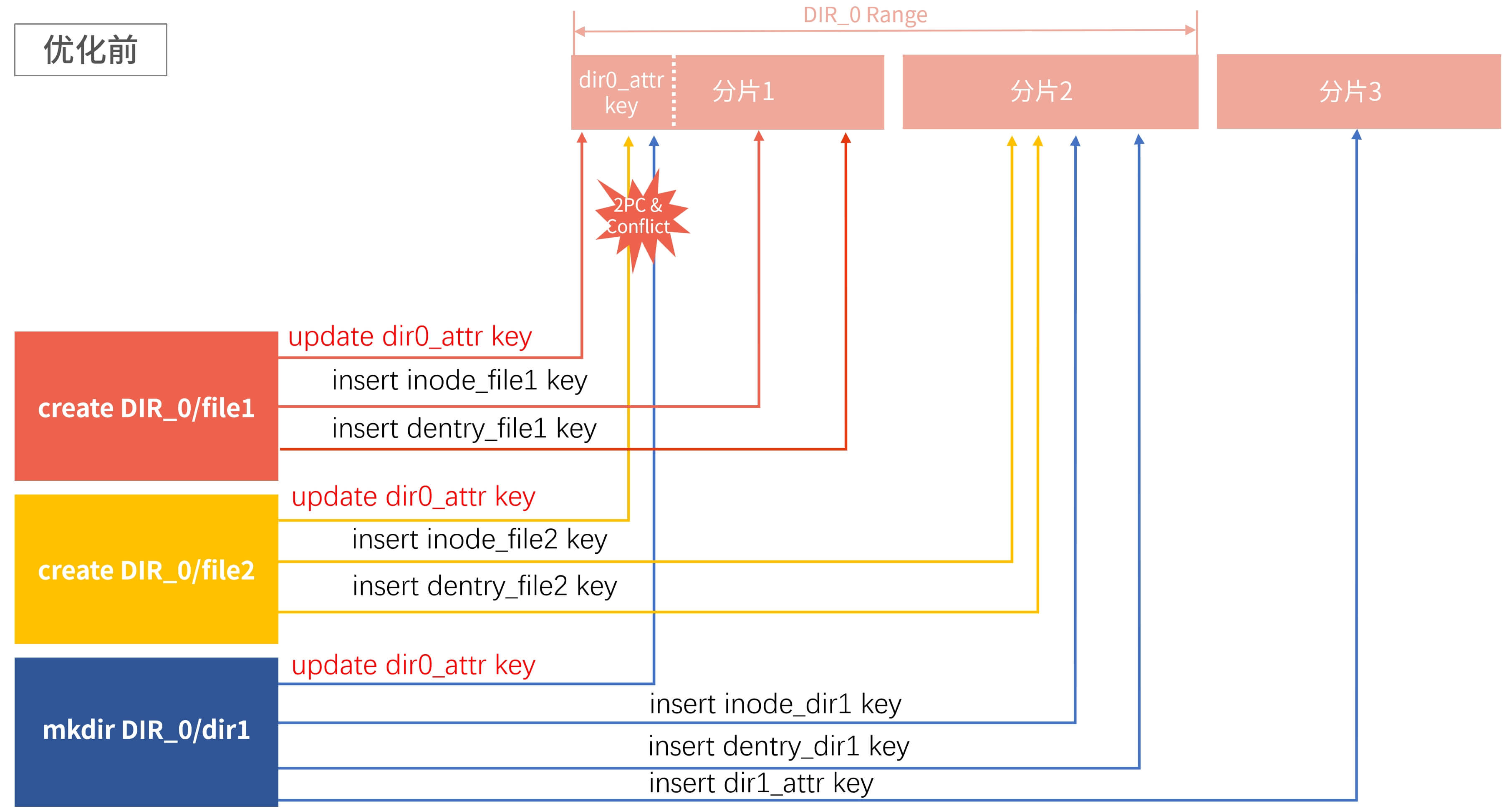 前述Metadata key的布局特点决定了文件系统的create、rename等常见更新类操作,若严格按照标准POSIX协议实现,在FoundationDB侧等同于一个事务中更新多个key的操作。例如创建一个文件,就会涉及到新增这个文件的inode key、dentry key以及修改其父目录inode key的属性信息。如果多个key被分配到KVDB集群的不同分片上,为保证事务操作的原子性会触发两阶段提交(2PC),相比单个key或者多个key落在同一个分片上的情况(可简化为1PC提交),时延明显增加。