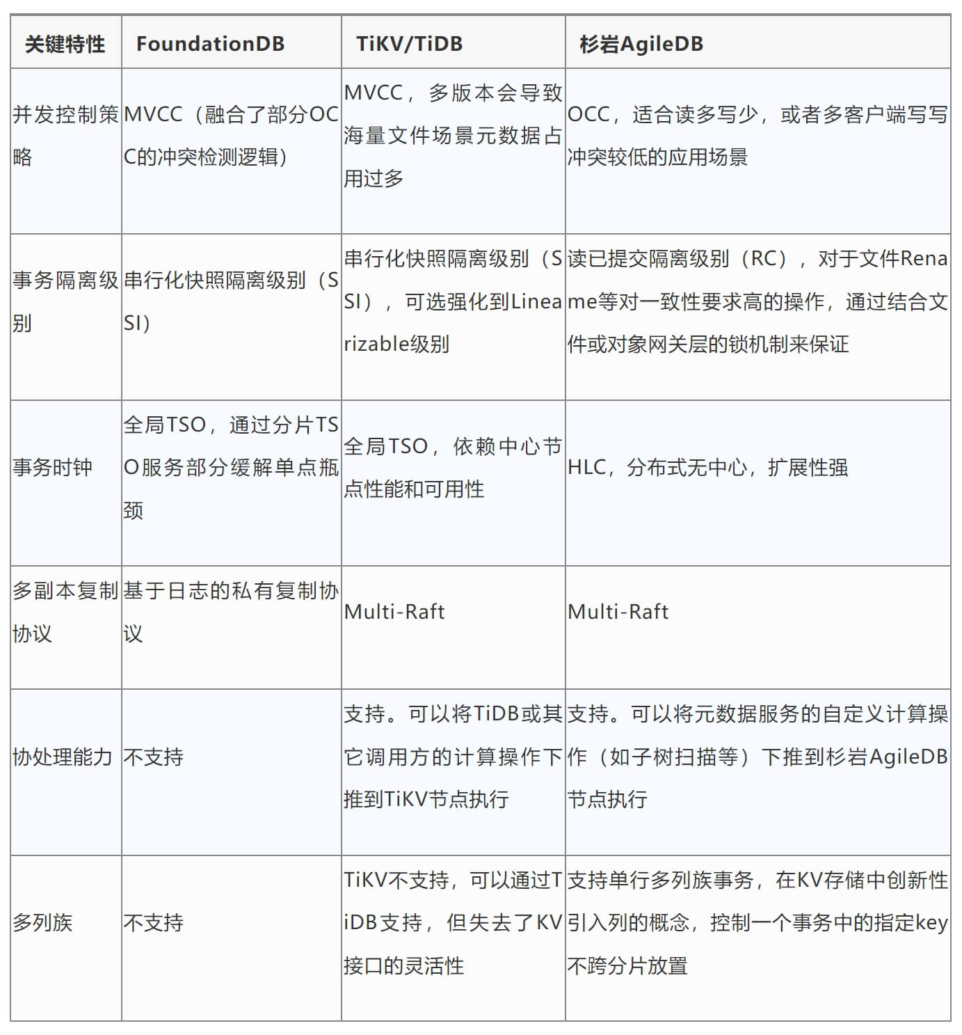 杉岩非结构化数据分布式统一存储产品的元数据服务也采用了与3FS类似的架构,但使用的不是FoundationDB等通用分布式KVDB,而是全自研的分布式KV存储——杉岩AgileDB。杉岩AgileDB与杉岩文件和对象存储产品的网关层联动配合,继承了基于分布式KVDB的文件系统元数据架构的优点,同时克服了其局限性。相较于通用分布式KVDB(下表以FoundationDB和TiKV为例进行说明),杉岩AgileDB在特性的实现方式上做了一些取舍,并且实现了一些独特功能,简单比较如下: