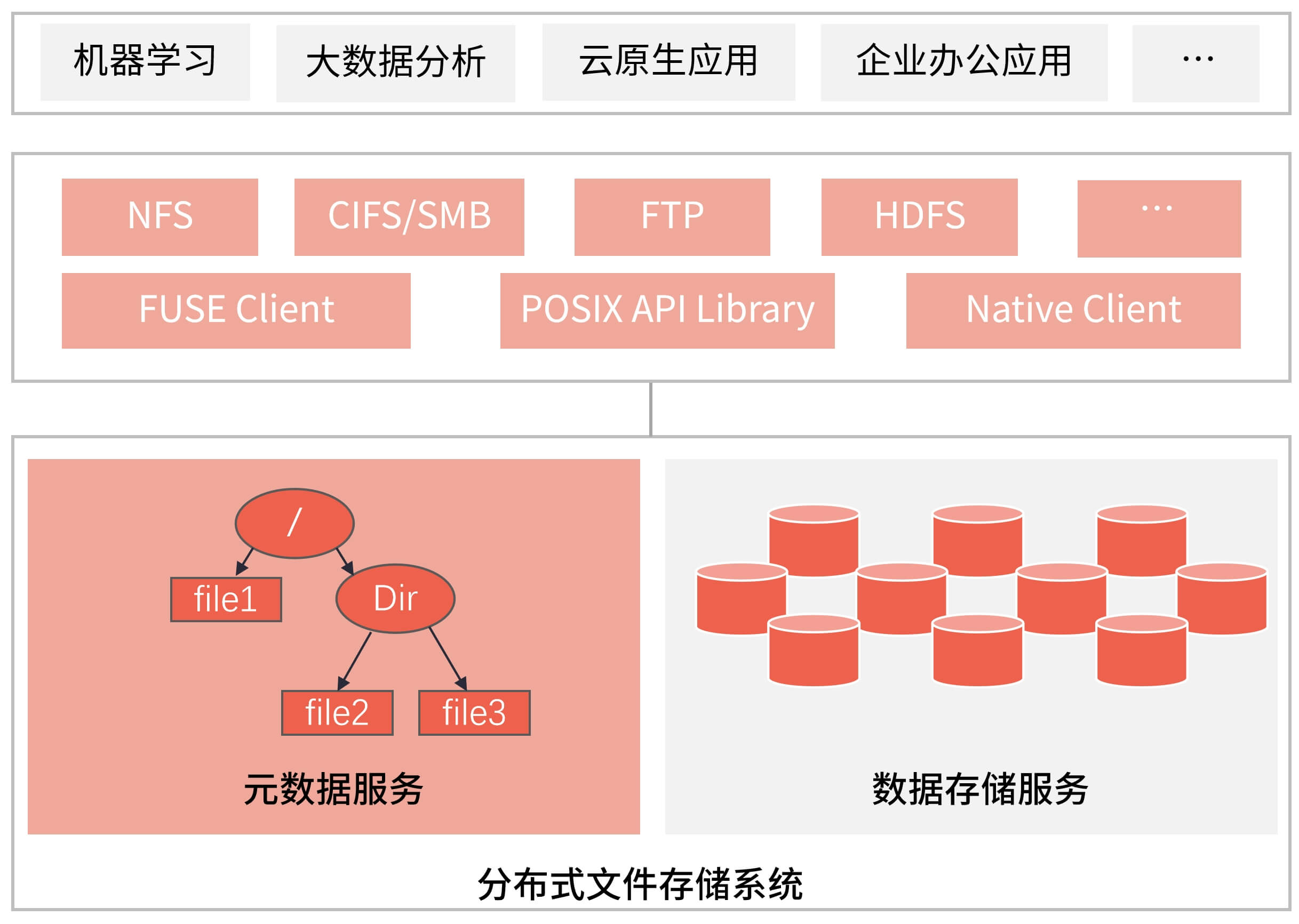 下图所示是现代分布式文件系统的典型架构,其中,元数据服务至关重要,在功能、性能、扩展性等诸多方面决定着分布式文件系统的规格和上限。