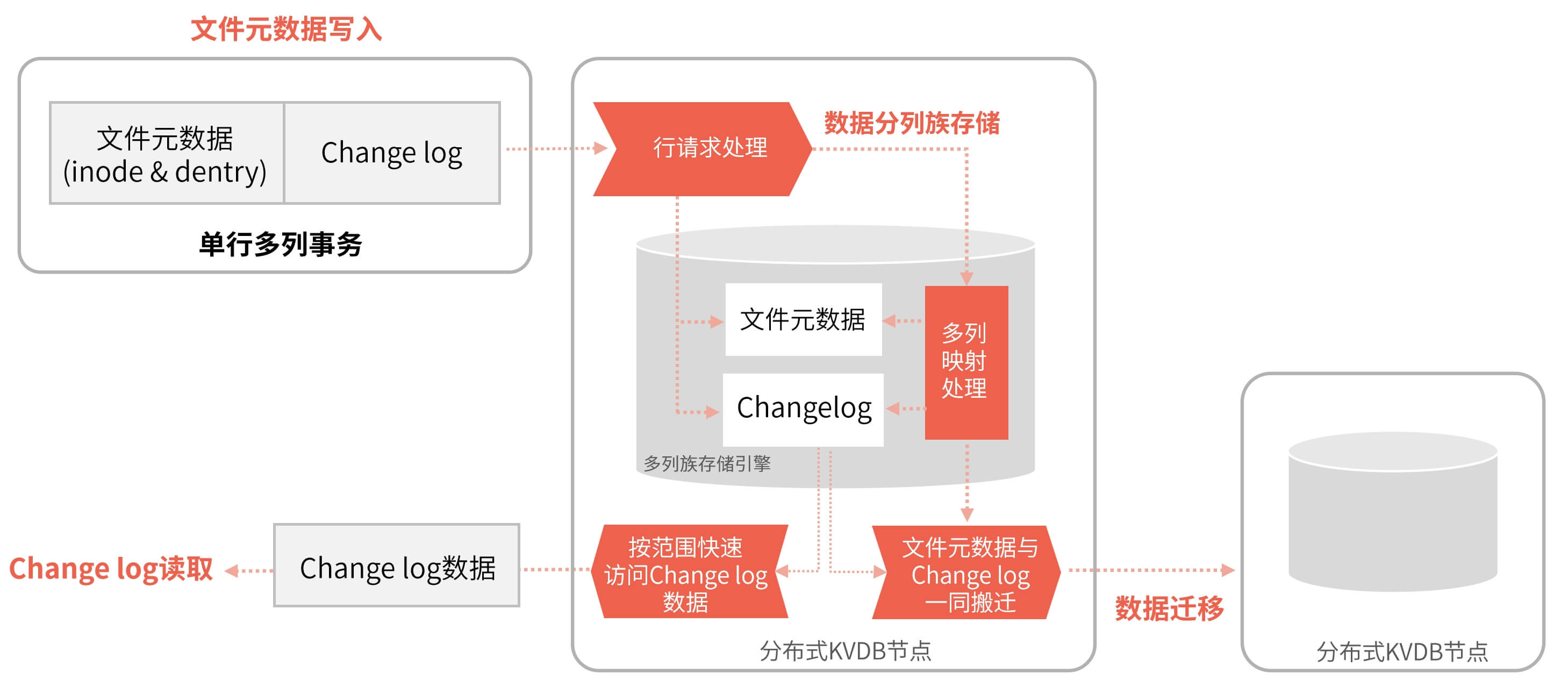 文件系统的一些高级功能均依赖按时间序保存的元数据Change log,比如异常场景下元数据的回放、跨站点的数据复制、元数据推送至其它大数据平台进行数据分析与检索等高级功能,这些功能要求Change log与文件元数据在写入KVDB时是强一致的。