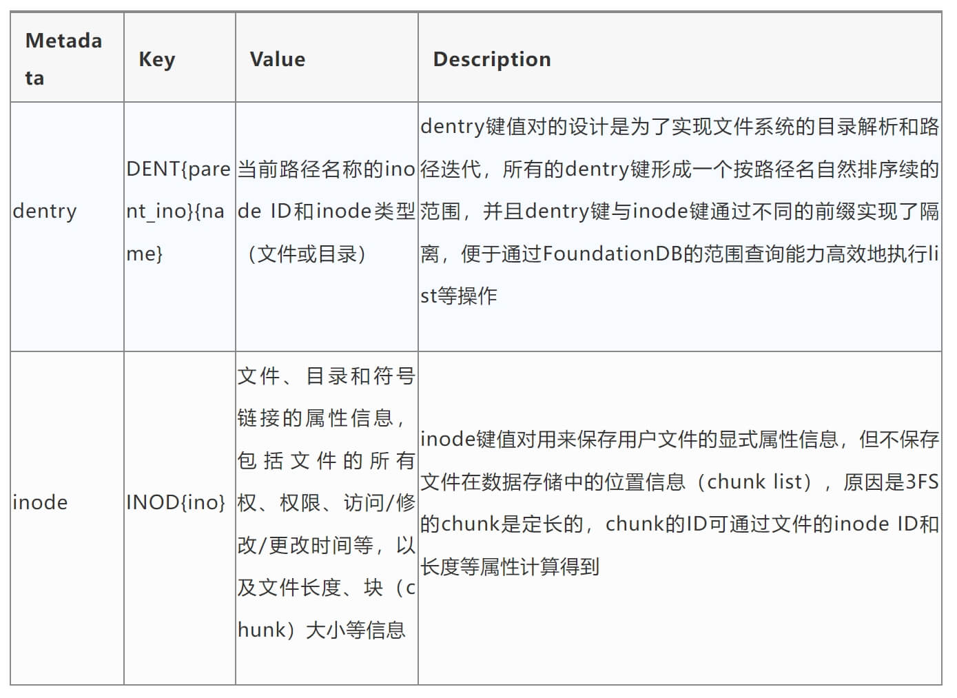 目前业界基于分布式 KVDB 系统来构建大规模文件和对象存储系统的元数据服务已形成流行趋势,如Google Colossus、Microsoft ADLS、HopsFS、JuiceFS等。这种趋势出现的背景是现代分布式KVDB或NoSQL存储系统技术发展的成熟。利用分布式KVDB的能力,能够极大简化元数据服务的设计,这已经成为很多存储系统,尤其是云存储的共识。分布式KVDB或NoSQL系统在分布式事务支持、扩展能力、高并发性能等方面的优势,使得基于其作为文件系统元数据的持久化层,来构建海量分布式文件系统的开发过程大大简化。3FS采用的正是这种架构,它使用FoundationDB来持久化文件元数据,包括文件路径、属性、目录结构等。其中核心键值对有两种: